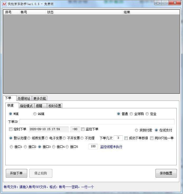 使用前将京东账号和密码按照规则放入文本,帐号----密码,中间是四个减号,因安全问题支付密码不建议输入,抢到了自己登陆账号再支付。