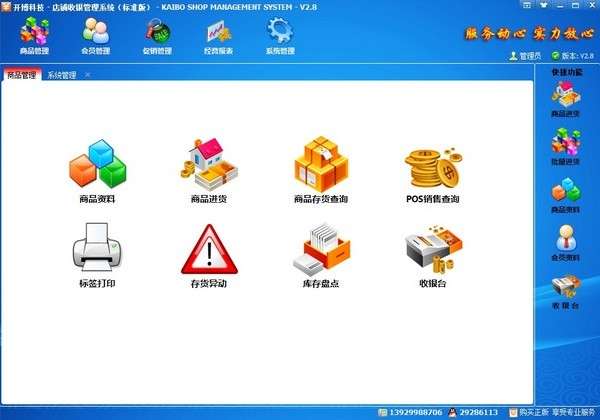 开博店铺收银管理系统具有操作简单、便捷,通俗易懂、简洁易用等特点。集成了收银POS管理、进仓管理、产品管理、条码管理、会员管理、积分管理、促销管理、短信发送等等店铺管理功能,特色的强大的会员积分充值管理等功能,支持电子秤功能等,还提供强大分析工具和报表功能,以实现公司对前台销售行为的统一管理、帮助管理者实时掌握店铺经营资讯,为灵活应对店铺经营需要、为公司的销售政策制定及决策支持提供必要的基础数据。