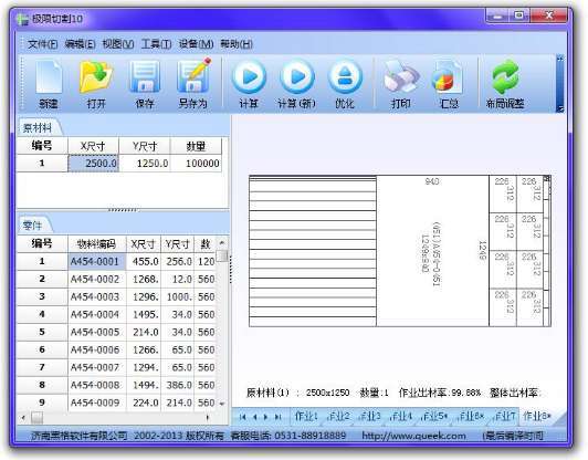《极限切割》是济南黑格软件有限公司2004年开发的一款专业排料优化计算软件。该软件计算速度快、出材率高、辅助功能丰富,集成了当今世界先进的排料算法,简单易学易操作,令您极大限度地节省宝贵的加工材料及时间,可广泛用于钣金、家具、石材、玻璃、装饰等行业。