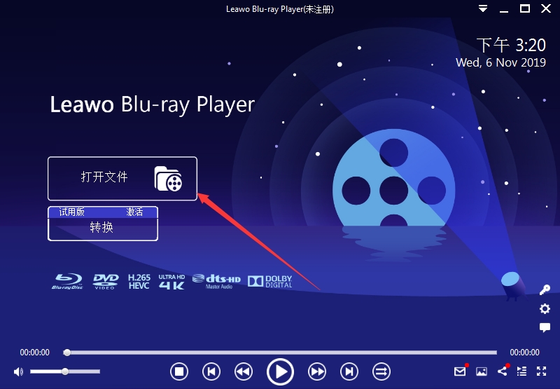 Leawo蓝光播放机在接口上提供了一些选项供您选择。您可以点击“打开文件”,浏览视频,音频,DVD播放IFO文件,或按一下播放蓝光或DVD光盘光盘标志。