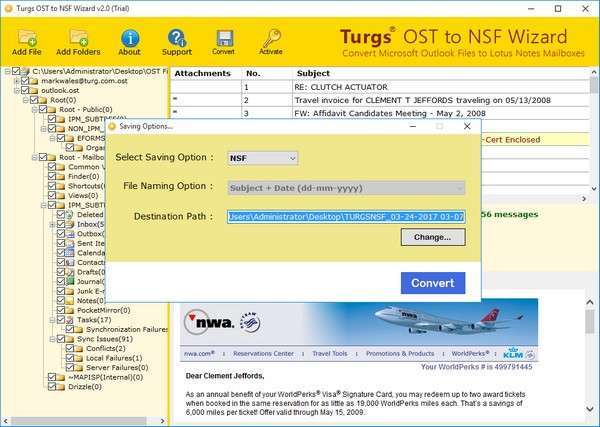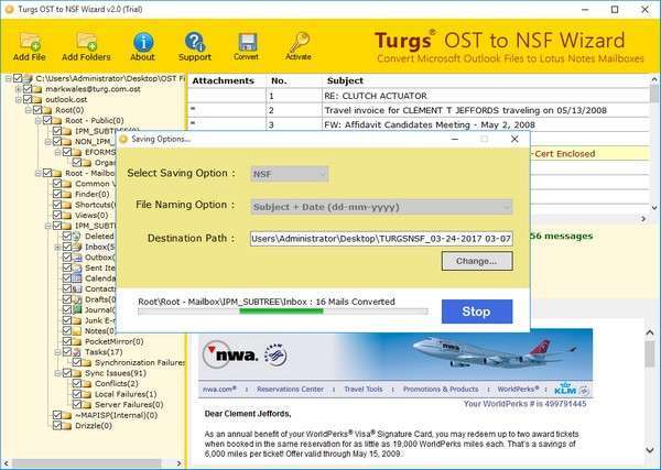 将 OST 电子邮件及其所有属性(to、cc、bcc、发送/接收日期和时间等)转换为 Lotus Notes NSF 文件格式。