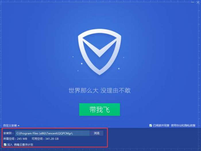 2、用户可以选择默认安装,直接点击界面的“带我飞”选项,软件就会默认安装到系统C盘中,或者用户点击界面左下角的“自定义安装”,然后在弹出的选项界面中点击浏览选择合适的安装位置,在下方还有“加入病毒云查杀计划”的选项,用户可以选择和取消勾选,完成后再点击“带我飞”。(小编建议用户选择自定义安装,将软件安装到其他盘中。因为C盘为系统盘,软件过多会导致电脑运行变慢。)