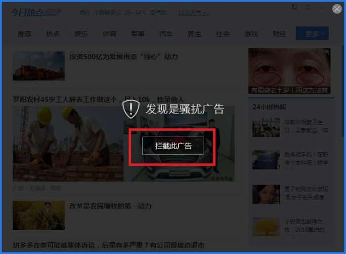 3、选择截图添加选项后,我们把截图框移到弹出的广告弹窗上,此时会提示用户:“发现是骚扰广告”,这个时候我们点击下方的“拦截此广告”就会被添加进拦截列表了。