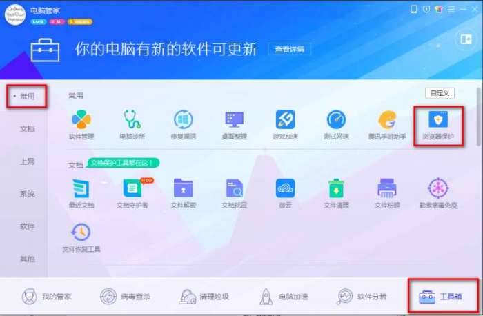 1、首先在本站下载安装好腾讯电脑管家,安装完成后在桌面找到快捷方式鼠标双击打开进入软件主界面,然后我们点击主界面下方的工具箱选项,然后再工具箱界面的左侧点击常用选项,在界面有侧就会显示出用户常用的功能,我们找到浏览器保护选项并点击。