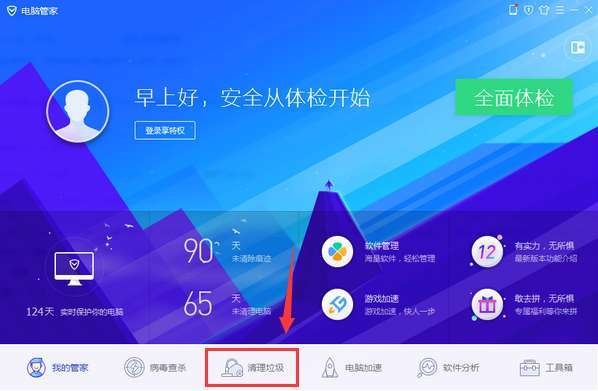 1、首先我们需要先打开腾讯电脑管家进入软件主界面,在界面下方我们可以看到有“病毒查杀”、“清理垃圾”、“电脑加速”等功能,我们点击“清理垃圾”功能。
