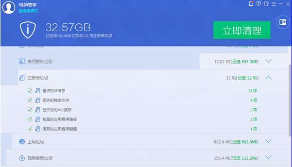 3、扫描完成后,腾讯电脑管家会将需要清理的垃圾展示在下方的列表中,勾选好要清理的内容后点击界面上方的“立即清理”即可。