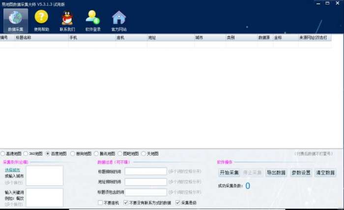 易地图数据采集大师是一款专业采集百度地图、360地图、高德地图、搜狗地图、腾讯地图、图吧地图、天地图商家、公司、店铺的手机、座机、地址、坐标等数据信息的软件,它与同类软件相比最显著特点是采集地图最专业、采集速度最快、采集最精准、操作方法最简单。
