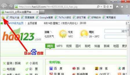 3、怎么添加喜欢的网页呢?方法其实跟其他版本的IE浏览器一样,在收藏夹栏的左边有一个黄色的五角星,如果你看到自己喜欢的网页,就点击一下这个黄色五角星。