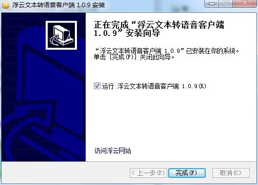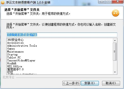 6、选择开始菜单的文件夹,默认需要使用的文件夹“浮云文本转语音客户端”,点击安装;