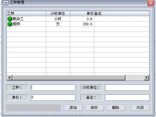 此窗口可以管理工种信息,工种信息将会影响计时工资。