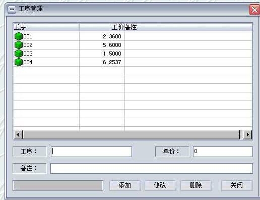 此窗口可以管理工序的基本信息。您可以在这里把贵司加工产品过程中用到的工序全部录入到这里,在产品资料管理窗口中,再对每个产品分别录入其工序,如果不同产品的工价不同,在产品资料管理中可以进行修改。此处不必分别对每一种产品设置一种工序。