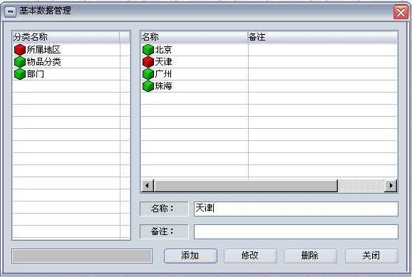 在此窗口中可管理一些基本的数据信息,例如:客户所属地区、物品分类、员工所属部分等。每一项中数据都不允许重复。