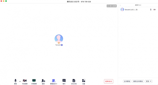 (3)全体静音:下方可支持您对当前会议内所有成员进行静音操作,您只需要点击“全体静音”即可,当有新成员加入会议时,也会默认被静音,会议内成员若想发言则需要点击“解除静音”举手向您申请,当您同意后,该成员才可发言