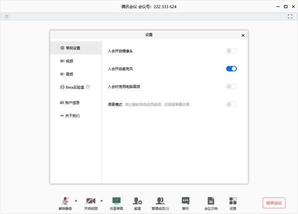 点击该按钮,即可唤出设置窗口,您可以在该窗口进行设备信息检测,查看您的摄像头、麦克风、扬声器是否被识别,同时可进入Beta实验室,体验最新黑科技