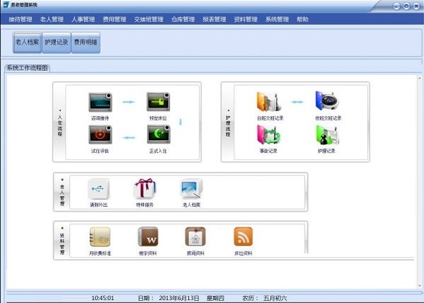 2、老人管理:从老人入住到离开 ,对老人的全面信息管理,主要功能包括:老人资料,入住登记,床位安排,转房登记,外出登记,特殊服务,护理记录,事故记录,退房登记