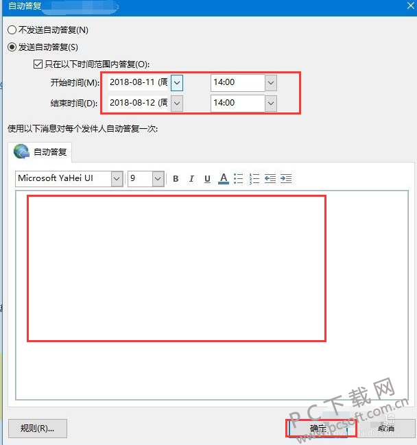 2、接下来我们就进入到自动回复的界面,我们选择发送自动回复选项,然后设置时间范围,在界面下方的选框中输入要恢复的内容,设置完成后点击确定就可以设置成功了,我们就可以返回到邮箱中进行测试了。
