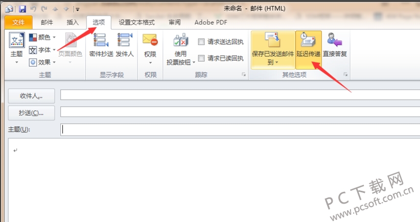 1、首先打开outlook邮箱,然后我们新建一封邮件,输入收件人以及邮件内容后,我们点击界面上方的“选项”,然后在下方的选项中找到“延迟传递”,如下图所示。