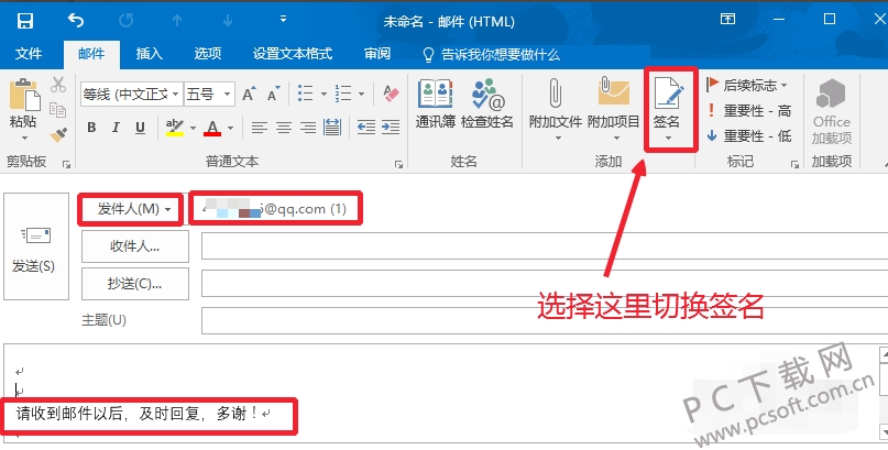 6、然后我们返回到Outlook邮箱洁面开始发送邮件,设置签名的邮箱在发送的时候回自动添加上设置的签名。非常方便,有需要的小伙伴赶紧来试试吧。