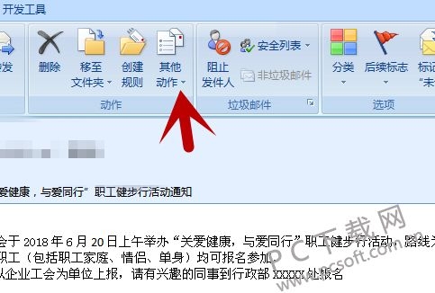 2、打开后,找到邮件菜单栏中的其他动作右下方的下拉按钮,然后点击;