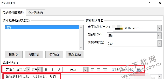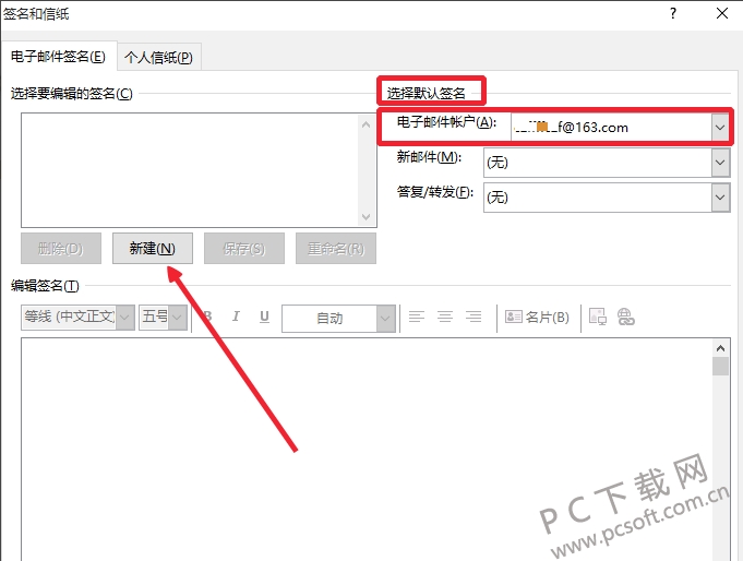 3、接下来我们就进入到签名和信纸界面,如果你有多个邮箱账户,那么我们需要现在界面右上角的电子邮箱账户选项中选择要设置签名的邮箱,然后再点击界面中的“新建”选项。