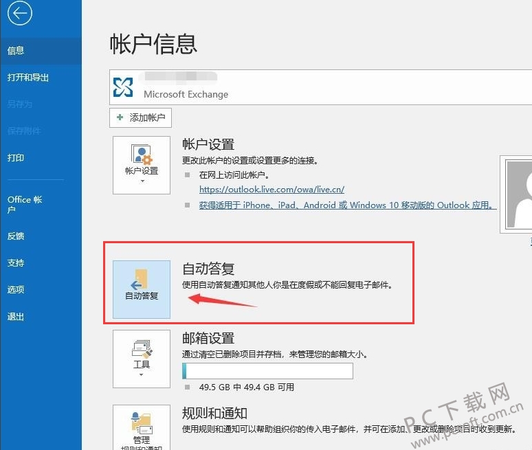 1、我们打开在电脑上安装好的outlook邮箱,然后进入到下图中的界面,我们点击界面左侧的“信息”,然后在界面右侧就可以看到“自动回复”的选项,我们点击该选项进入下一步。