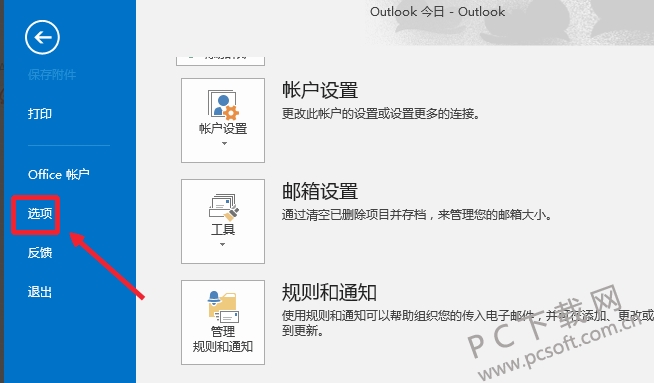 1、我们在本站下载安装好Outlook邮箱后,我们打开进入到邮箱主界面,然后点击界面上方的“文件”选项,会出现下图二中的界面,我们点击界面左侧的“选项”。