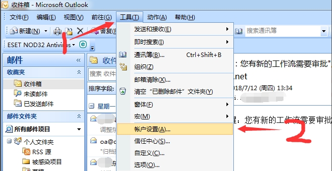 1、打开安装好的Outlook邮箱,打开邮箱后点击菜单栏中的【工具】在弹出的选项中点击【账户设置】。