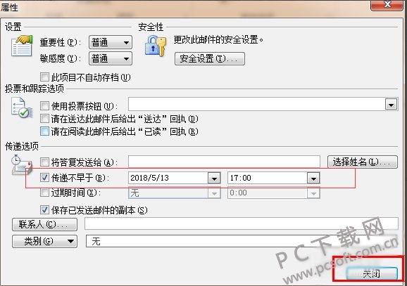 2、接下来进入到下图中的界面,我们在传递选项中设置传递不早于的时间,如下图所示,我们选择想要发送的时间,然后点击关闭后回到邮件界面,点击发送。