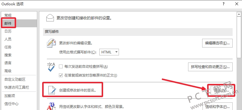 2、进入到Outlook邮箱选项界面,如下图所示,我们点击界面左侧的“邮件”选项,然后在界面右侧可以看见有个创建或修改邮件的签名,我们点击“签名”选项,进入下一步。