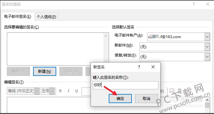 4、接下来会弹出新签名的窗口,我们输入签名的名称。输入完成后点击确定。