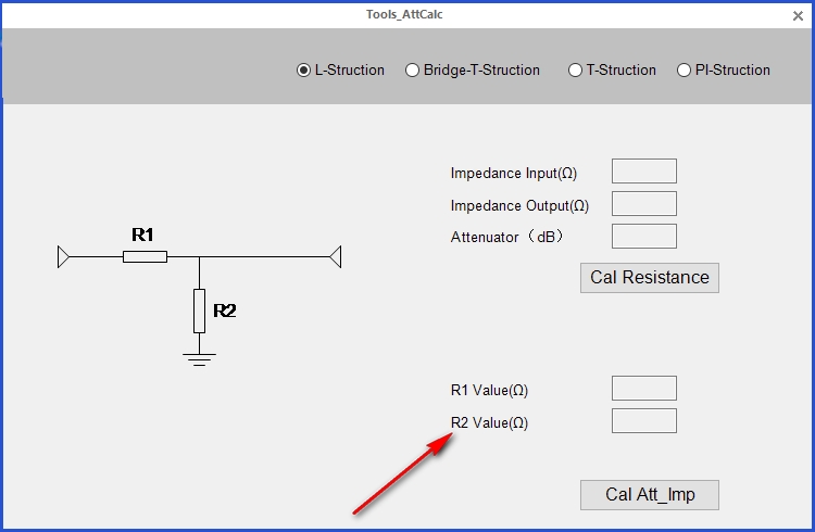 3、打开AttCalc可以在界面选择衰减器的拓扑结构,可以在软件查看电路,可以设置阻抗内容