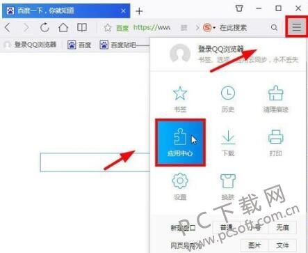 1、首先打开我们已经安装好的QQ浏览器,然后点击右上角的灰色部分三条杠的地方,如下图所示。在这里单击应用中心进入。