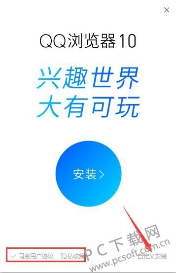 1、在本站下载qq浏览器安装包。双击运行它,就会打开如下界面,勾选用户协议。你可以直接点击安装,这样QQ浏览器会以程序默认设置方式快速安装在你的电脑上,这里小编提醒大家默认是安装在C盘目录下的,不想占用系统盘资源的小伙伴可看下一步,选择自定义安装。