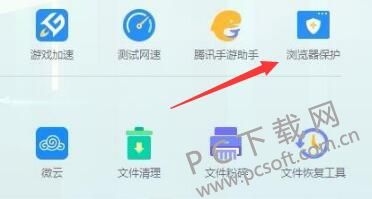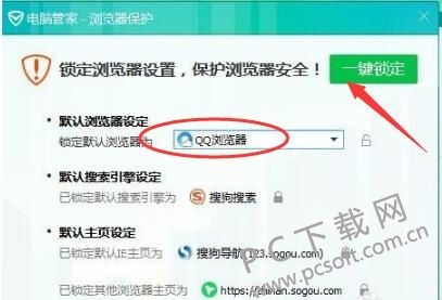 4、再弹出的浏览器保护界面中,在默认浏览器设定处点击下拉三角选择QQ浏览器,如下图所示;