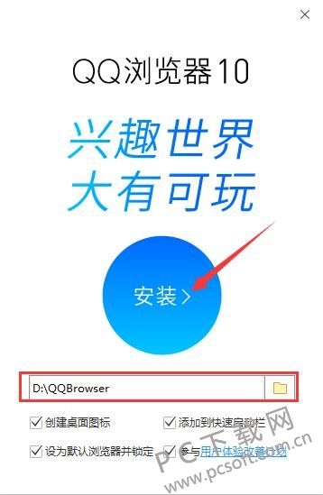 2、选择自定义安装:可点击主界面右下角的自定义选项,之后就会看到如下图,在弹出的路径框中为QQl浏览器设置一个合适的安装位置即可。在这里我们还看到有几个附加选项:创建桌面图标、添加到快速启动栏、设为默认浏览器并锁定等,大家可根据的需求自行勾选。