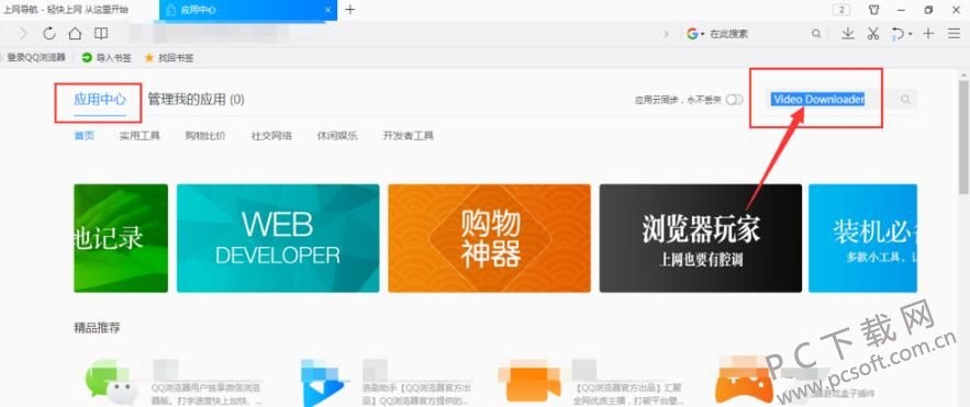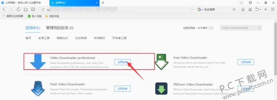 2、进入到应用中心后,在右侧的搜索框中输入 Video Downloader点击搜索即可。(安装此应用就可下载视频了。)