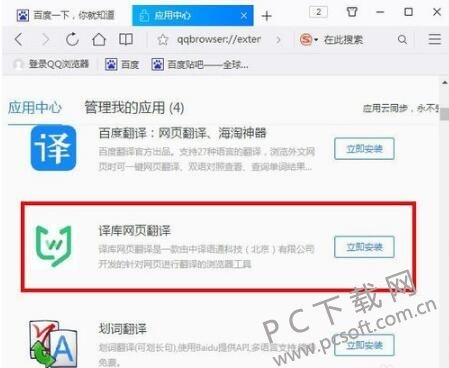 3、在搜索项找到“译库网页翻译”插件,点击安装。