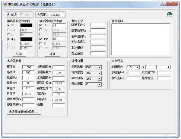 表冷器及状态点计算软件是一款十分好用的表冷器计算软件,该软件功能强大,是针对表冷器制作的,表冷器及状态点计算软件最新版可根据表冷器参数、换热器前后空气参数、处理风量等,快速计算出空气密度、蒸汽分压、空气阻力以及水阻力,解决手动计算麻烦并容易出错的问题。