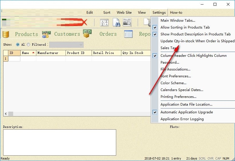 7、主窗口的功能设置上,允许在产品选项卡中排序、在产品选项卡中显示产品说明、发货时更新库存数量