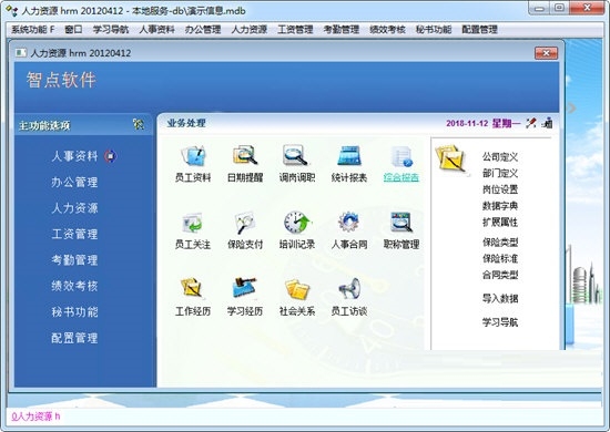 智点人力资源管理系统官方版是款非常高效实用且严谨专业的人力资源管理工具,智点人力资源管理系统官方版拥有非常详细而又实用的功能,涵盖了HR部门对员工的各项人事管理,从企业的人力资源规划开始,包括组织机构、个人信息、合同档案管理、考勤管理、人才招聘等一系列全面的功能,且智点人力资源管理系统提供各种查询统计功能与报表输出功能。