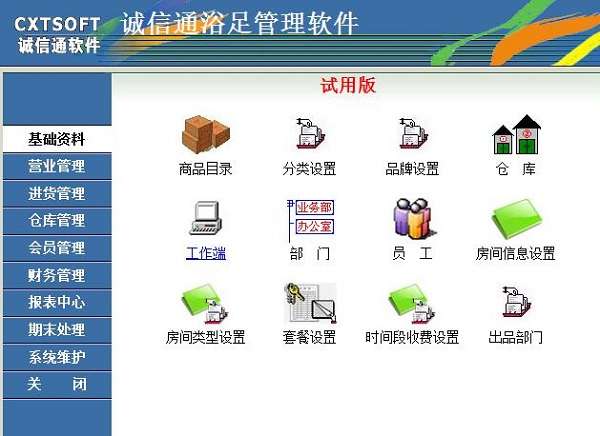 诚信通浴足管理系统最新版是一款足浴经营管理软件。诚信通浴足管理系统最新版包含了前台查看、业务查询、收银查询、客户管理、进货开单、进货退货、付款单、供应商、库存查询、仓库调拨、会员管理、财务管理、报表中心以及期末处理等主要功能。诚信通浴足管理系统可以随时备份系统中的数据。