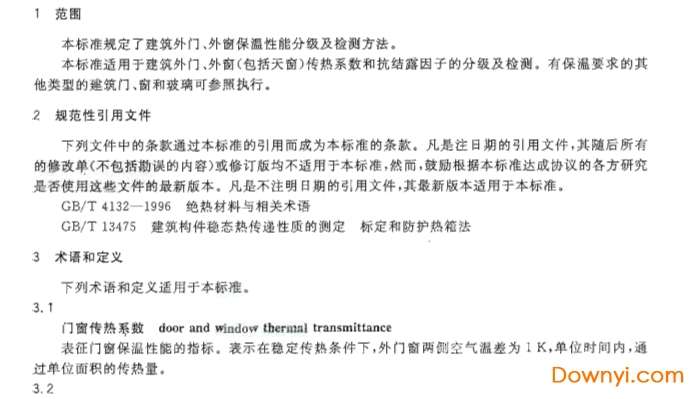 本标准规定了建筑外门、外窗保温性能分级及检测方法。适用于建筑外门、外窗(包括天窗)传热系数和抗结露因子的分级及检测。有保温要求的其他类型的建筑门、窗和玻璃可参照执行。