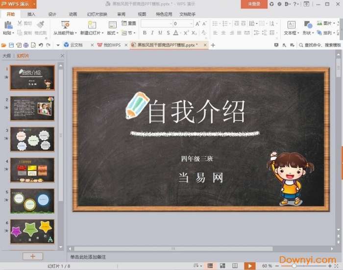 模板共分为8页,所谓竞选,其实就是将自己做一个详细的介绍,好让同学和老师信服你,所以说你要介绍自己的一些兴趣爱好、还有你在学习中的一些表现,还有你在平时生活中和同学们相处的关系等等。