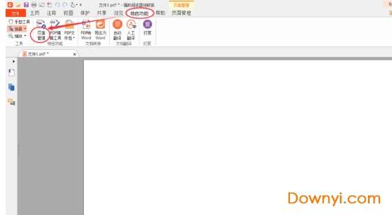 2、然后点击福昕PDF阅读器菜单栏中【特色功能】,然后选择【页面管理】选项。