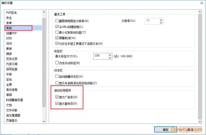 2、打开偏好设置窗口后,点击左侧的【常规】,在右侧界面中找到启动应用程序,取消勾选【显示广告条】和【现实宣传页】,然后点击【确定】。