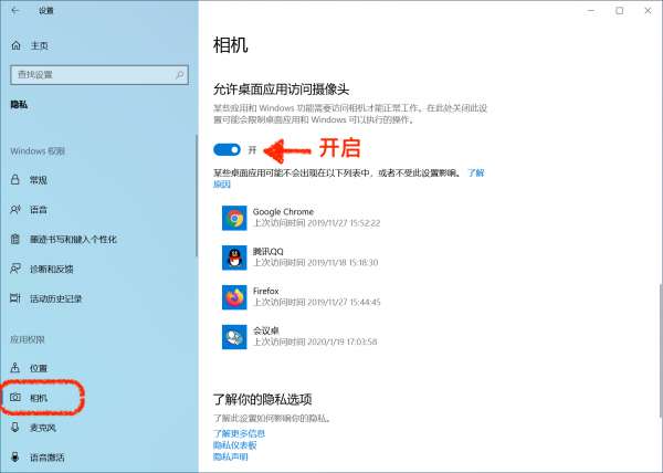 1、请在「系统」-「隐私」-「应用权限」中,允许会议桌访问「相机」和「麦克风」