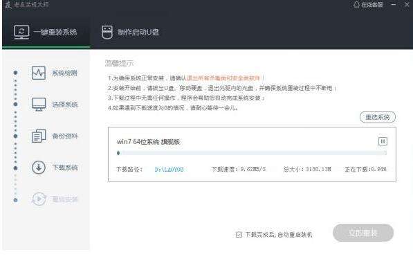 到了这一步时用户即可离开电脑,程序会全自动完成重装步骤。为防止出现安装失败,用户也可以选择“制作启动U盘”进行U盘装机。