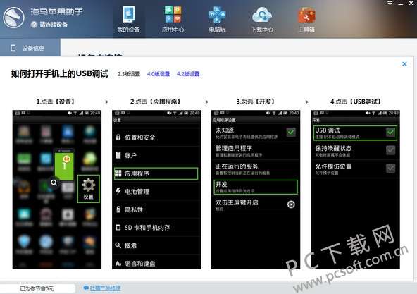 3、 检查您是否有开启了【USB调试】功能,如果您对开启方法不清楚也不要着急,海马助手会帮助您