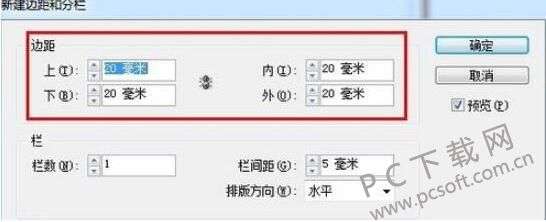 3、点击右下角的“边距和分栏”按钮,可打开其对话框,在这里可手动调整页面边距及分栏。这个还是看自己的需求,如不要求可不用更改,按默认设置即可。