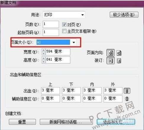 2、打开新建文档对话框框,在这里可以选择页面尺寸大小,还可以设置其它相关参数。